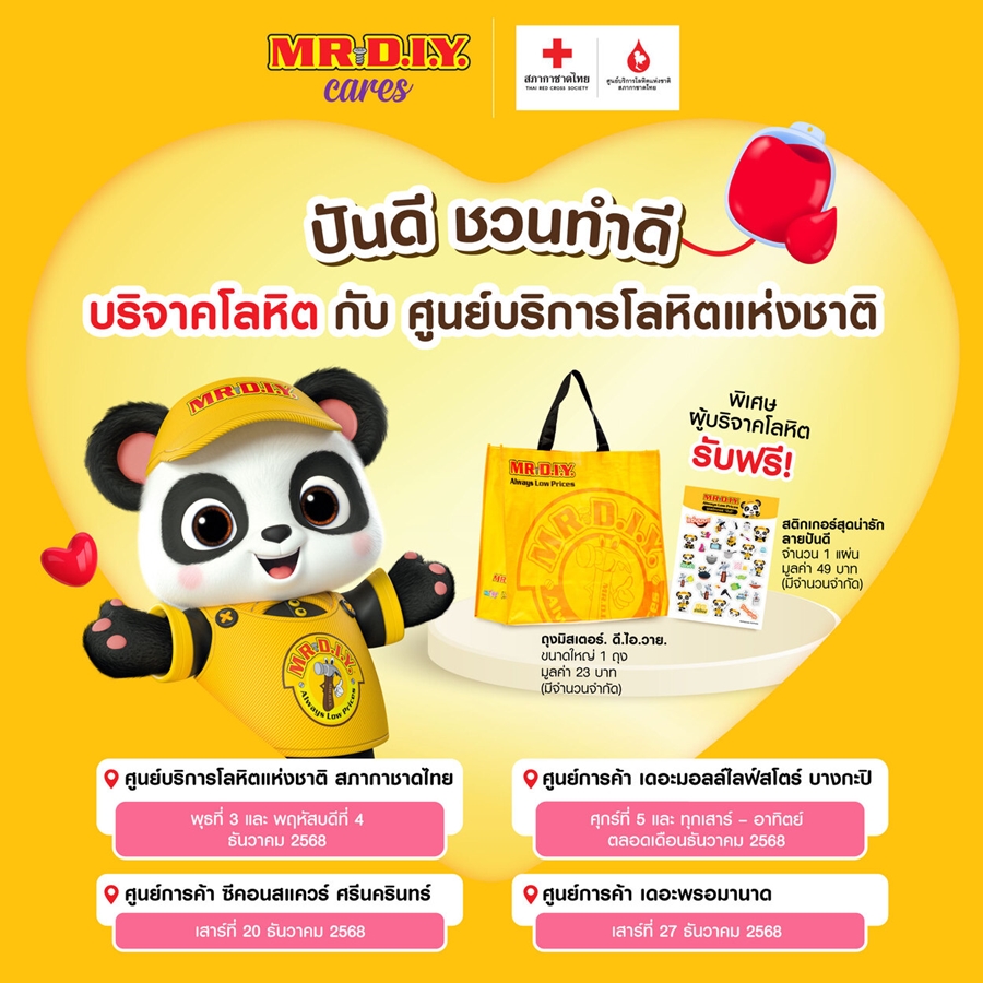 ตลอดต้นเดือนธันวาคมที่ผ่านมา มิสเตอร์. ดี.ไอ.วาย. ได้ร่วมสนับสนุนการบริจาคโลหิตกับสภากาชาดไทยในหลายพื้นที่ อาทิ ศูนย์บริการโลหิตแห่งชาติ หน่วยรับบริจาคประจำเดอะมอลล์ ไลฟ์สโตร์ บางกะปิ ซึ่งได้รับการตอบรับจากประชาชนเป็นอย่างดี โดยผู้สนใจยังสามารถร่วมบริจาคโลหิตได้อีก 2 จุดหลักในช่วงปลายเดือนธันวาคม ได้แก่ หน่วยรับบริจาคโลหิตเคลื่อนที่ ศูนย์การค้า ซีคอนสแควร์ ศรีนครินทร์ ในวันเสาร์ที่ 20 ธันวาคม 2568 และ หน่วยรับบริจาคโลหิตเคลื่อนที่ ศูนย์การค้าเดอะพรอมานาด ในวันเสาร์ที่ 27 ธันวาคม 2568 เพื่อเตรียมโลหิตสำรองช่วยผู้ป่วยในช่วงเทศกาลปีใหม่ ผู้ร่วมบริจาคโลหิตในเดือนธันวาคมนี้ยังจะได้รับของที่ระลึกจำนวนจำกัด ได้แก่ ถุงมิสเตอร์. ดี.ไอ.วาย. ขนาดใหญ่ (L) 1 ถุง และ สติกเกอร์ลายปันดี 1 แผ่น เพื่อเป็นกำลังใจแทนคำขอบคุณจากใจ