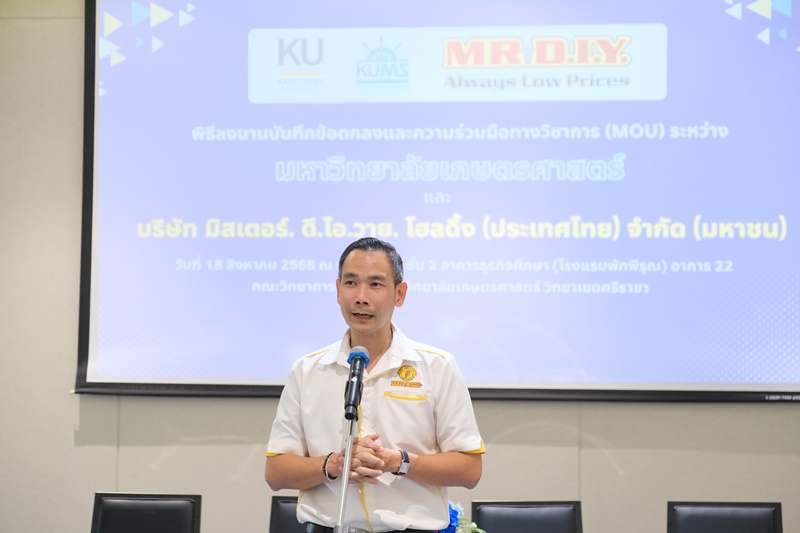 กรุงเทพฯ, 20 สิงหาคม 2568 – บริษัท มิสเตอร์. ดี.ไอ.วาย. โฮลดิ้ง (ประเทศไทย) จำกัด (มหาชน) นำโดย คุณอานุภาพ คงมาลัย รองประธานบริหารฝ่ายการตลาด ร่วมกับ มหาวิทยาลัยเกษตรศาสตร์ โดย คณะวิทยาการจัดการ ได้จัดพิธีลงนามบันทึกข้อตกลงทางวิชาการ (MOU) ร่วมกัน โดยมี ดร.จุมพฏ บริราช คณบดีคณะวิทยาการจัดการ มหาวิทยาลัยเกษตรศาสตร์ วิทยาเขตศรีราชา เป็นผู้แทนร่วมลงนาม ทั้งนี้ได้รับเกียรติจาก ผศ.ดร.นิภา นิรุตติกุล อาจารย์ประจำสาขาการตลาดดิจิทัลและการสร้างตรา มหาวิทยาลัยเกษตรศาสตร์ วิทยาเขตศรีราชา และ นางสาวพิชามญชุ์ กุจะพันธุ์ ผู้จัดการอาวุโส ฝ่ายสื่อสารองค์กร บริษัท มิสเตอร์. ดี.ไอ.วาย. เทรดดิ้ง (ประเทศไทย) จำกัด ร่วมเป็นสักขีพยาน ณ อาคารธุรกิจศึกษา (พักพิรุณ) มหาวิทยาลัยเกษตรศาสตร์ วิทยาเขตศรีราชา